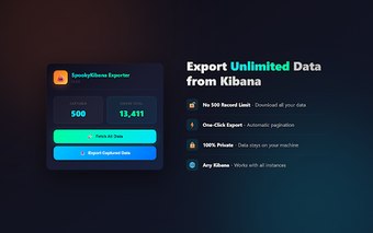 SpookyKibana - Kibana Data Exporter är en kostnadsfri webbläsartillägg som är utformad för att underlätta exporten av stora datamängder från Kibana. Med detta verktyg kan användare enkelt kringgå den begränsning på 500 poster som vanligtvis gäller och ladda ner hela sina frågeresultat. Tillägget kräver ingen komplicerad konfiguration och erbjuder en smidig och säker lösning för databehandling direkt på den lokala enheten.